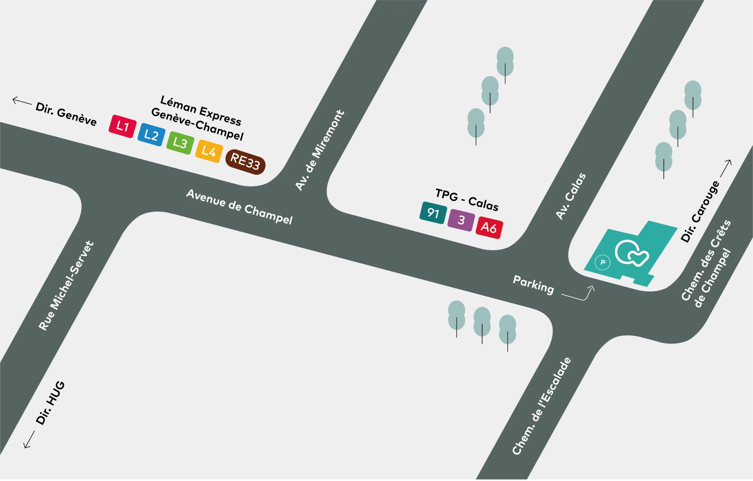 Notre établissement se situe à proximité du Léman Express (Gare CEVA Genève-Champel à 50 mètres) ainsi que des lignes de bus n°3 et 91 (arrêt Calas à 20 mètres), ainsi que des lignes de bus n°1, 5 et 7 (arrêt Claparède à 100 mètres, avec connexion ligne 3). Un parking gratuit est à disposition des patients du centre d’hémodialyse.